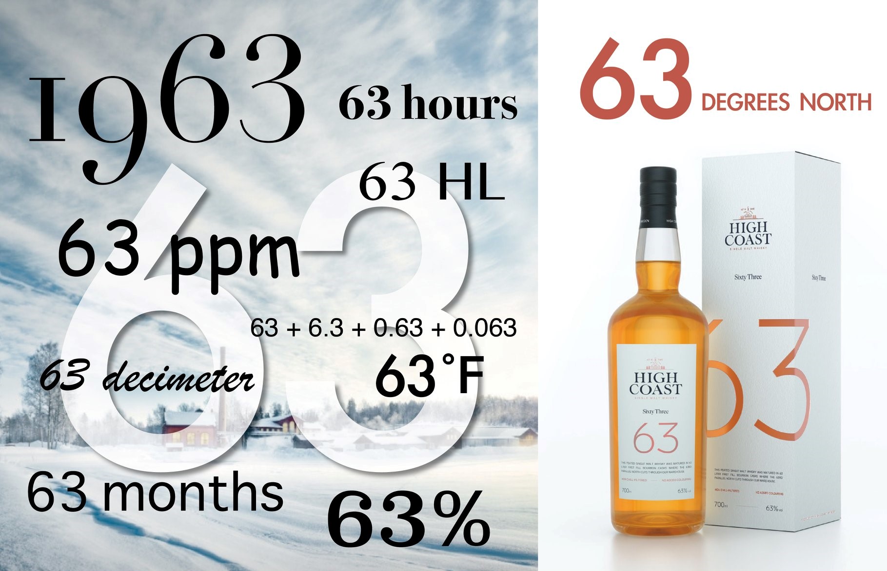 在將木桶放在倉庫中那條北緯63度線上離地63 decimeter (分米)的架上陳放了63個月,然後將酒精度設在63%,